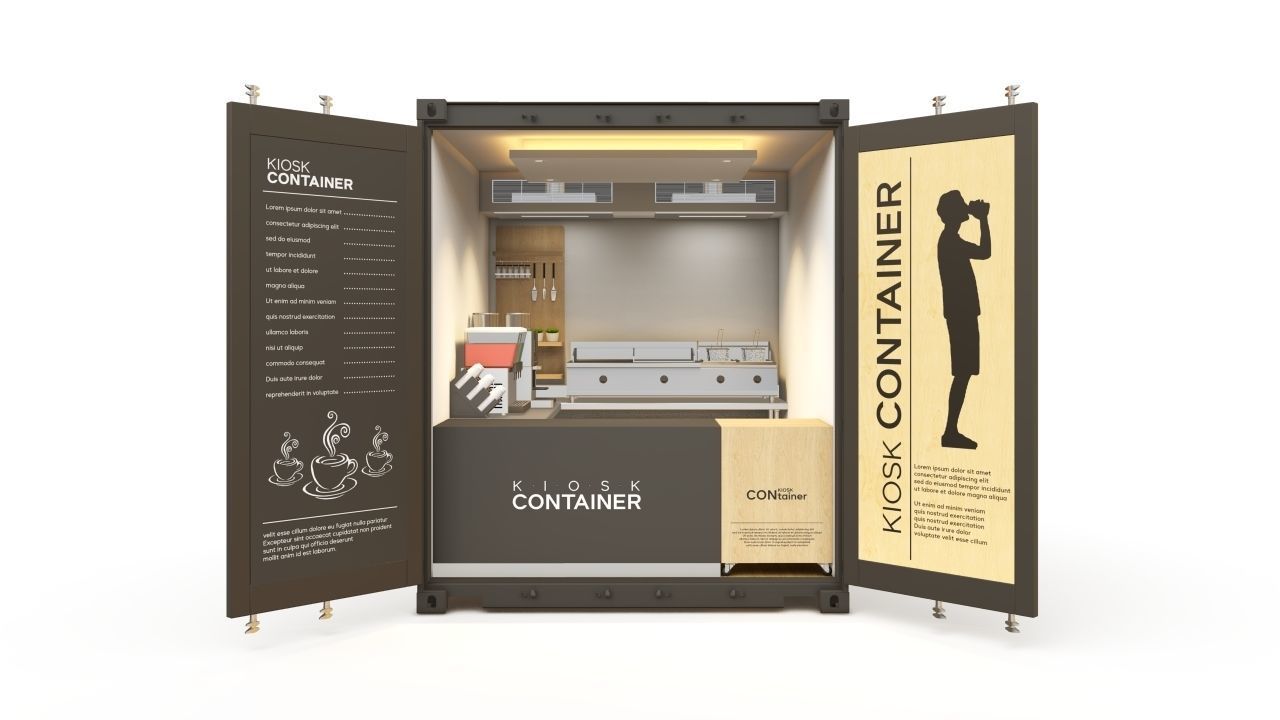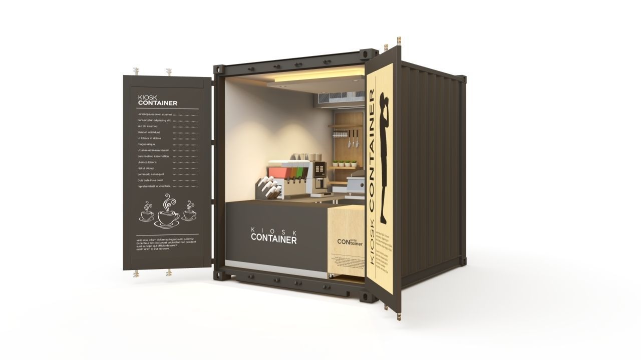 Bên trong kios được bố trí quầy pha chế, kệ để đồ, hệ thống đèn, ổ điện, đảm bảo đầy đủ công năng để vận hành quán café hoặc đồ uống quy mô nhỏ. Ngoại thất phối màu tối giản hiện đại, phù hợp đặt tại các khu phố trẻ, khu du lịch, trường học, bãi biển hoặc các khu tổ chức festival.